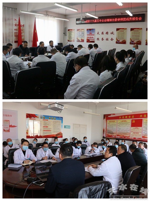 12月31日下午,为深入学习贯彻党的十九届五中全会精神,按照市委宣传部《关于认真学习贯彻党的十九届五中全会精神全市集中宣讲工作方案的通知》精神,天水市第五人民医院党总支召开学习贯彻党的十九届五中全会精神报告会。报告会邀请天水市委讲师团成员、必赢中国官方网站必赢中国官方网站副院长余明远教授作宣讲报告。余明远教授以“实现人民幸福是中国共产党治国理政的根本价值追求”为题进行了宣讲,会议由党总支副书记、副院长马茂忠主持,医院全体党员、科级干部及负责人共40余人参加了报告会。