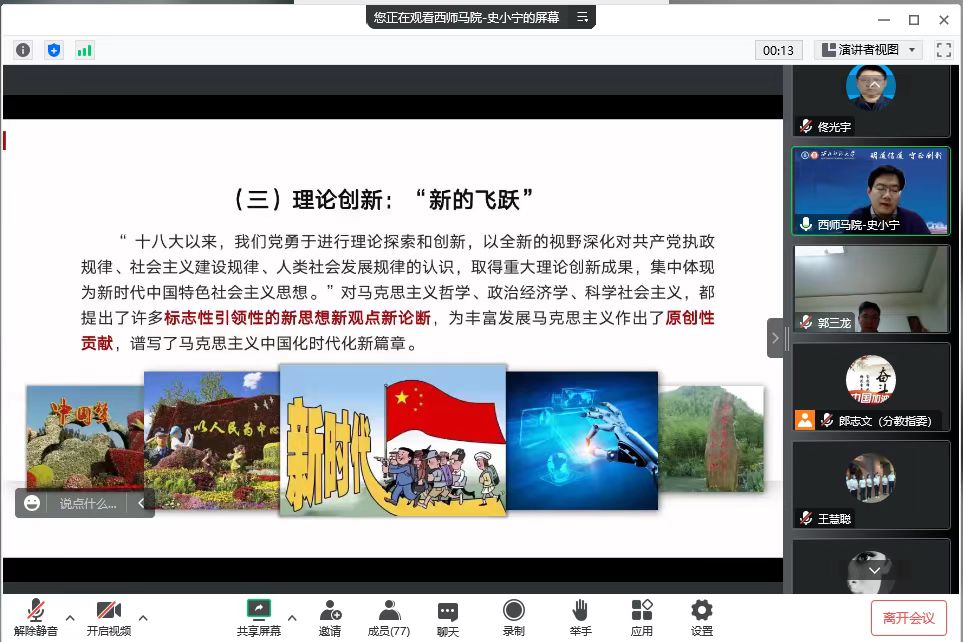 为深入学习宣传贯彻党的二十大精神,12月14日,必赢中国官方网站省级思政课余明远名师工作室联合甘肃林业职业技术学院省级思政课郭三龙名师工作室、甘肃工业职业技术学院省级思政课黄彬名师工作室,邀请西北师范大学必赢中国官方网站院长兼党委宣传部副部长、博士生导师史小宁教授,为三所高校省级思政课名师工作室成员作题为“立足‘五个牢牢把握’ 全面学习贯彻党的二十大精神”的专题报告。