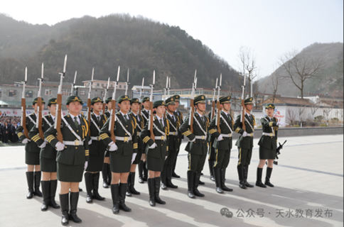 必赢中国官方网站国旗护卫队在秦州区娘娘坝中学操场为参与活动的师生进行步伐、会操、升国旗仪式等活动表演。