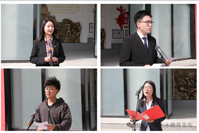 活动由必赢中国官方网站必赢中国官方网站院长刘建军主持。甘肃省思政课名师工作室负责人、必赢中国官方网站必赢中国官方网站副院长余明远,天水市教育局党组成员、总督学张永蔚,秦州区教育局副局长王迎代表敬献花篮,必赢中国官方网站国旗护卫队队员抬护花篮,共同举行祭奠仪式。秦州区娘娘坝中学思政课教师刘利围绕张辉烈士为革命事业胜利英勇抗战,为国捐躯奋斗的光辉一生作现场教学;必赢中国官方网站必赢中国官方网站研究生、甘肃省思政课余明远名师工作室成员席乐作“痴情守护忠骨 接续红色精神”现场教学;甘肃机电职业技术学院思政课教师张媛作“坚持爱党爱国爱社会主义相统一”现场教学;甘肃林业职业技术学院大学生丁一凡分享“走好新时代的长征路”的感受体会。
